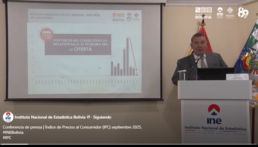 Este jueves el Instituto Nacional de Estadística (INE) dio a conocer los datos sobre la inflación hasta septiembre, mes que es el ‘menos inflacionario’ en lo que va del año; sin embargo, el acumulado de la gestión ya alcanzó el 18,33%. “Por tercer mes consecutivo la inflación baja, y al mes de septiembre ha llegado a tan solo a 0,2%”, manifestó Humberto Arandia, director del INE. Según Arandia, esto se debe a que en meses pasados había problemas asociados a la oferta de productos, a los bloqueos y al tipo de cambio del dólar. Cabe destacar que la alusión de Arandia hace referencia la cotización del dólar en el mercado paralelo donde se cotiza por encima de los 12 bolivianos, muy por encima de los 6,96 que fijó el Banco Central de Bolivia (BCB). El director del INE dijo que al eliminarse esas “distorsiones” la inflación también comienza a bajar. Según Arandia, no sería extraño que en los próximos meses incluso lleguen a registrarse una inflación negativa. “Porque el tipo de cambio (paralelo) está bajando, dijo.