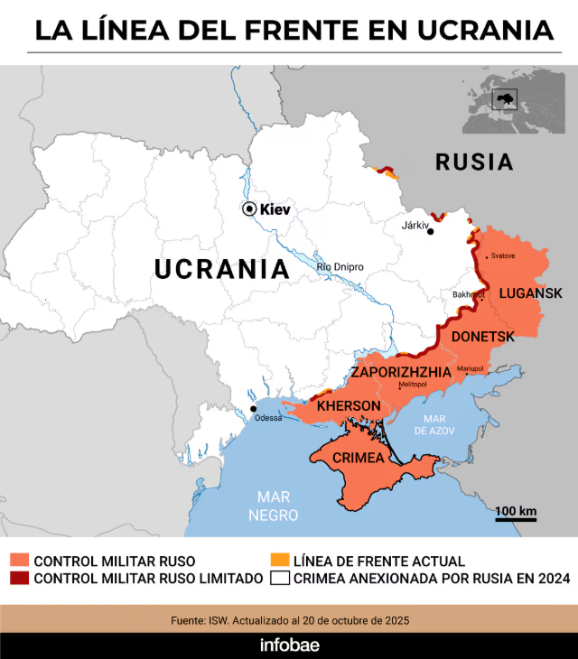 Rusia controla actualmente alrededor de una quinta parte del territorio ucraniano, principalmente en el este y sur del país. Las fuerzas rusas ocupan gran parte de las regiones de Luhansk y Donetsk —conocidas colectivamente como el Donbás— así como porciones significativas de las regiones de Zaporizhzhia y Kherson. Moscú también mantiene el control de Crimea, que anexó en 2014.