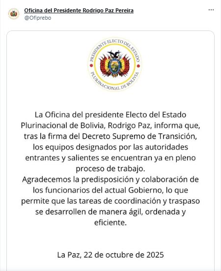 La oficina del presidente electo del Estado Plurinacional de Bolivia, Rodrigo Paz Pereira, estrenó una nueva cuenta oficial en la red social X (antes Twitter). A través de este canal, denominado Oficina del Presidente Electo del Estado Plurinacional de Bolivia, se compartirá información oficial vinculada al proceso de transición gubernamental y a las actividades de la Presidencia y del mandatario electo.