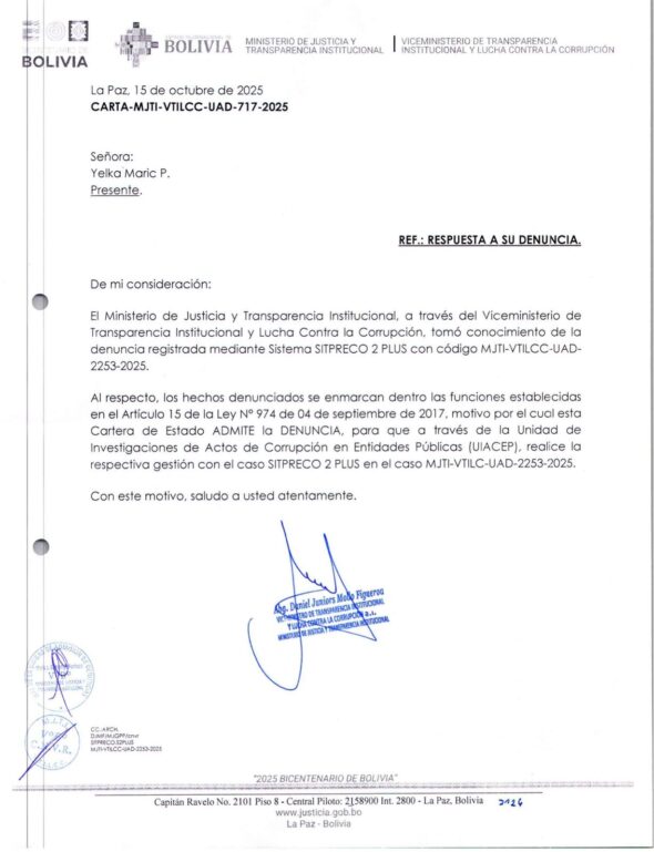 La respuesta oficial del Ministerio, compartida por la concejala, especifica que «el Viceministerio de Transparencia Institucional y Lucha Contra la Corrupción tomó conocimiento de la denuncia registrada mediante Sistema SITPRECO 2 PLUS con código MJTI-VTILCC-UAD-2253-2025».