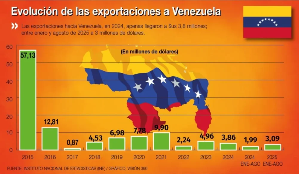 Las exportaciones a Venezuela en 2015 alcanzaron su mayor valor (57,13 millones de dólares), en 2016 llegaron a 12,81 millones de dólares, pero desde entonces la ventas han sido mínimas. Por ejemplo, 0,87 millones de dólares en 2017 o 9,9 millones de dólares en 2021, 2,24 millones de dólares en 2022, o 4,96 millones de dólares en 2023 y 3,86 millones de dólares en 2024. Al mes de agosto de 2025, las ventas suman 3,09 millones de dólares de acuerdo con el INE.