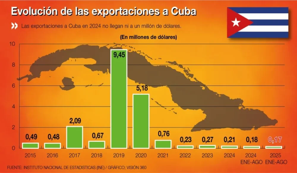 Las exportaciones a Cuba, el otro socio de Bolivia en el ALBA, son aún más ínfimas, Entre enero y agosto de 2025 apenas llegan a 0,17 millones de dólares, según los datos del INE.