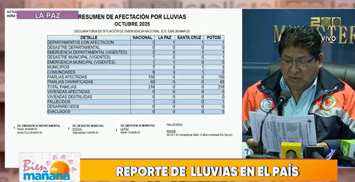 Además, se registran efectos severos de heladas y granizadas en Chuquisaca, La Paz, Potosí y Tarija, con 59 comunidades afectadas y 3.243 familias impactadas, de las cuales 1.220 resultaron damnificadas. Tarija declaró desastre departamental, mientras que Potosí reporta emergencia por daños agrícolas. “En el tema de las heladas y granizadas, igualmente hay 4 departamentos con afectación: Chuquisaca, La Paz, Potosí, Tarija. Un departamento está con desastre departamental, Tarija, y otro con emergencia departamental, Potosí” refirió.