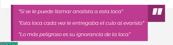 En este reporte también se hace referencia al término ‘irrespetuosa’, incluido dentro de la categoría misoginia. La mayoría de estos comentarios se dirigieron a entrevistadoras reconocidas, como Cecilia Bellido, María Galindo y Jimena Antelo, figuras públicas que destacan por el carácter crítico de sus entrevistas.