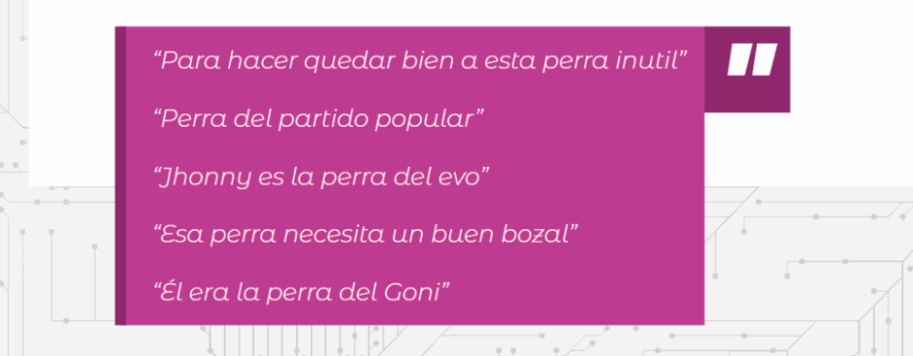 De igual manera, el término “perra” sexualiza la experiencia de las mujeres en la política y está asociado a estereotipos sexuales de género. Habitualmente, se emplea para referirse a mujeres consideradas promiscuas y, en ese sentido, se convierte en un recurso para cosificarlas, sexualizarlas, degradarlas y deshumanizarlas, añade el informe.