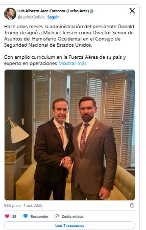 En el mensaje compartido en las redes, Arce le pide a Quiroga que explique ”sobre su reunión con Michael Jensen, de qué conversaron y a qué acuerdos arribaron”.