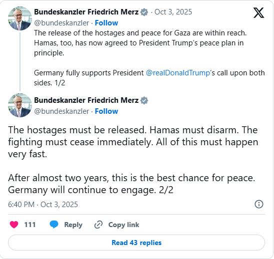 «La liberación de los rehenes y la paz en Gaza están al alcance. Hamás también aceptó en principio el plan de paz del presidente Trump», agregó en otra publicación en la misma plataforma.