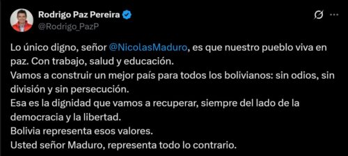 «Vamos a construir un mejor país para todos los bolivianos: sin odios, sin división y sin persecución. Esa es la dignidad que vamos a recuperar, siempre del lado de la democracia y la libertad. Bolivia representa esos valores. Usted, señor Maduro, representa todo lo contrario», afirmó el mandatario boliviano electo en sus redes sociales.
