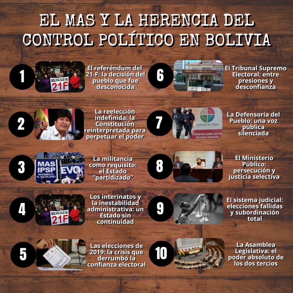 Un recuento realizado para este reportaje da cuenta de al menos 10 quiebres institucionales que el MAS deja como herencia al país, entre los que se pueden citar el prorroguismo del expresidente Evo Morales, el desconocimiento del voto ciudadano en el referéndum del 2016 y en las elecciones del 2019, la toma de instituciones que deberían ser independientes, el sometimiento de la justicia, entre otros aspectos.