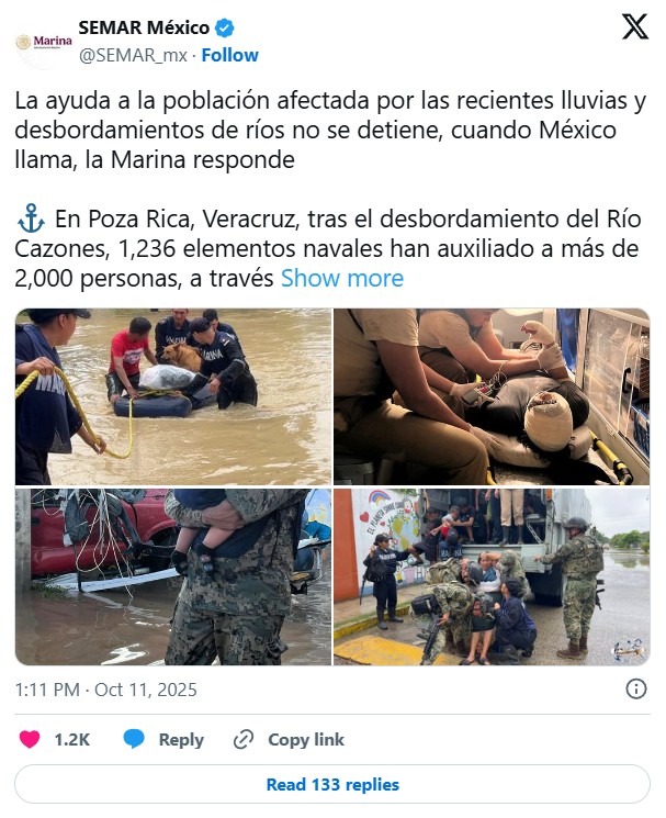 «Están desplegados integrantes y equipos del gobierno de México para la apertura de caminos y atención a las comunidades», escribió la mandataria en la red X tras una reunión por video con los gobernadores de los estados afectados.