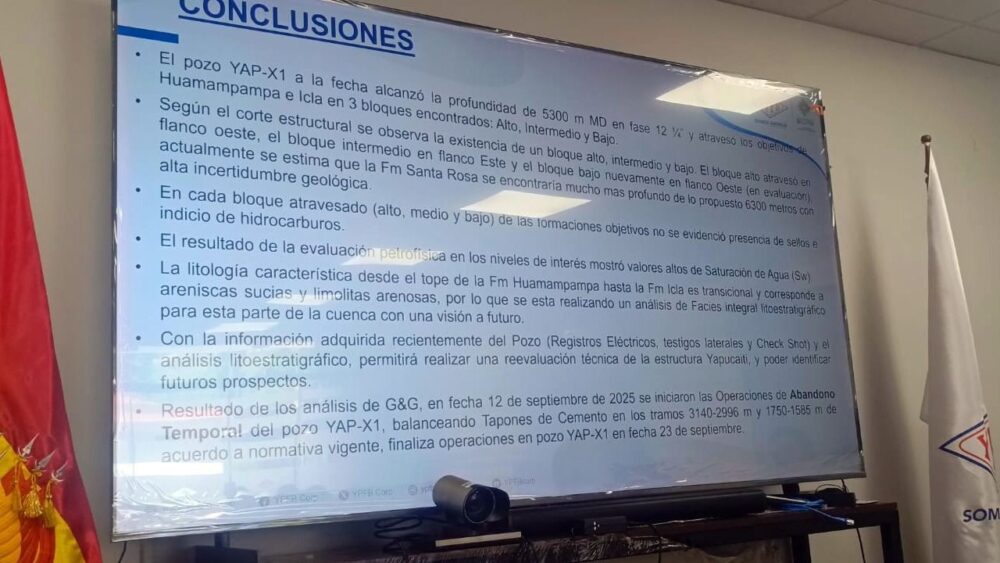 De acuerdo a la exposición de los técnicos de YPFB y por los resultados de los análisis geológicos y geofísicos (G&G), “en fecha 12 de septiembre de 2025 se iniciaron las operaciones de abandono temporal del pozo YAP-X1, balanceando tapones de cemento en los tramos 3.140-2.996 m y 1.750-1.585 m, de acuerdo a normativa vigente, finaliza operaciones en pozo YAP-X1 en fecha 23 de septiembre”.