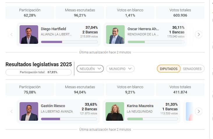 - Neuquén: 3 senadores nacionales, 3 diputados nacionales
