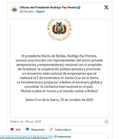 “Rodrigo Paz Pereira, sostuvo una reunión con representantes del sector privado (empresarios y emprendedores) nacional con el propósito de fortalecer la cooperación público-privada y promover un encuentro internacional de empresarios que se realizará el 7 de noviembre en Santa Cruz de la Sierra”, reza el reporte.