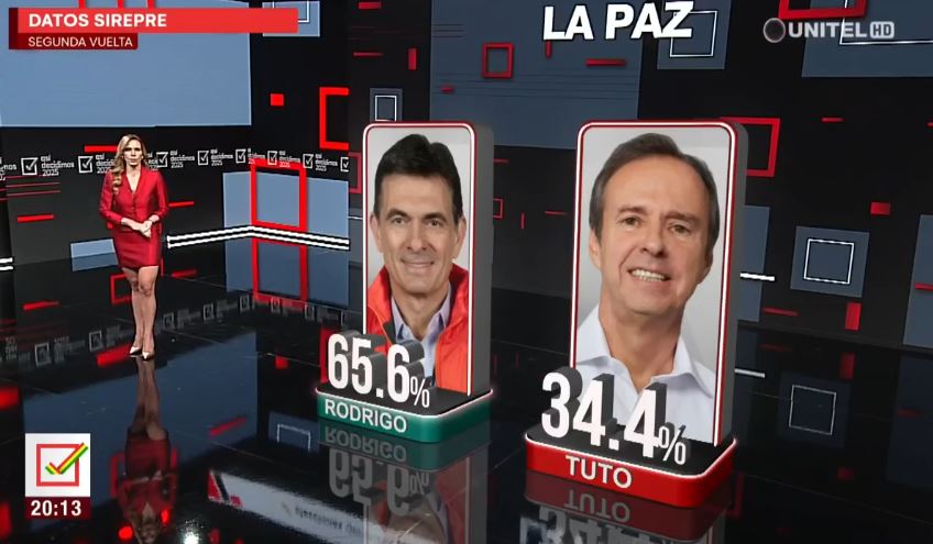 La Paz.- El binomio Rodrigo Paz – Edman Lara logró una victoria contundente en los departamentos del eje central del país, según los resultados preliminares de la segunda vuelta electoral. En La Paz, Paz alcanzó un 65,6% de los votos frente al 34,4% obtenido por Jorge Tuto Quiroga, mientras que en Cochabamba el nuevo presidente electo consiguió el 61,1%, dejando a su contrincante con el 38,9%.