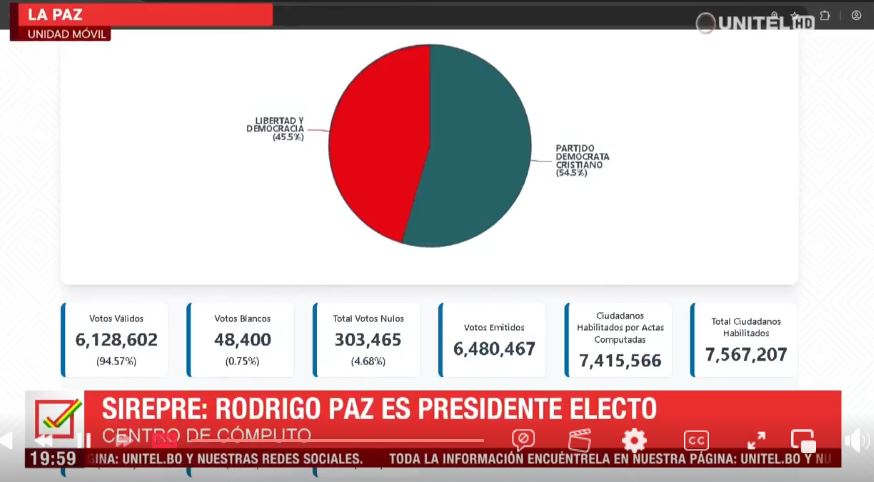 Bolivia vivió este domingo un giro político histórico. Según los resultados de conteo rápido del Sirepre, al 98% el binomio Rodrigo Paz – Edman Lara logró imponerse en la segunda vuelta con el 54% de los votos, frente al 45% obtenido por Jorge Tuto Quiroga y Juan Pablo Velasco, asegurando así la Presidencia de Bolivia para los próximos cinco años.