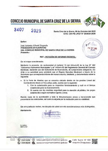 El concejal José Quiroz, en ejercicio de su rol fiscalizador, presentó una petición de informe al Órgano Ejecutivo Municipal para esclarecer varios aspectos relacionados con la Feria de las alasitas, que se desarrolla en el Parque Urbano del Cambódromo.