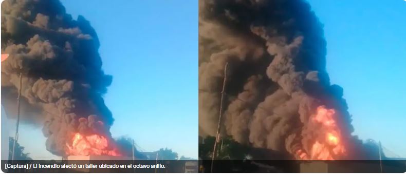 Un incendio de magnitud afectó la tarde de este domingo un taller ubicado en la avenida Santos Dumond y octavo anillo de la ciudad de Santa Cruz, cerca de la refinería de Palmasola.