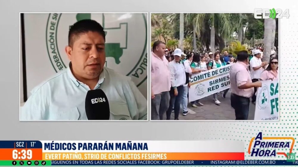Este lunes, el secretario de Conflictos de la Federación de Sindicatos de Ramas Médicas de Salud Pública (Fesirmes) de Santa Cruz confirmó el paro de 24 horas que realizarán el martes 28 de octubre en los hospitales de primer y segundo nivel.