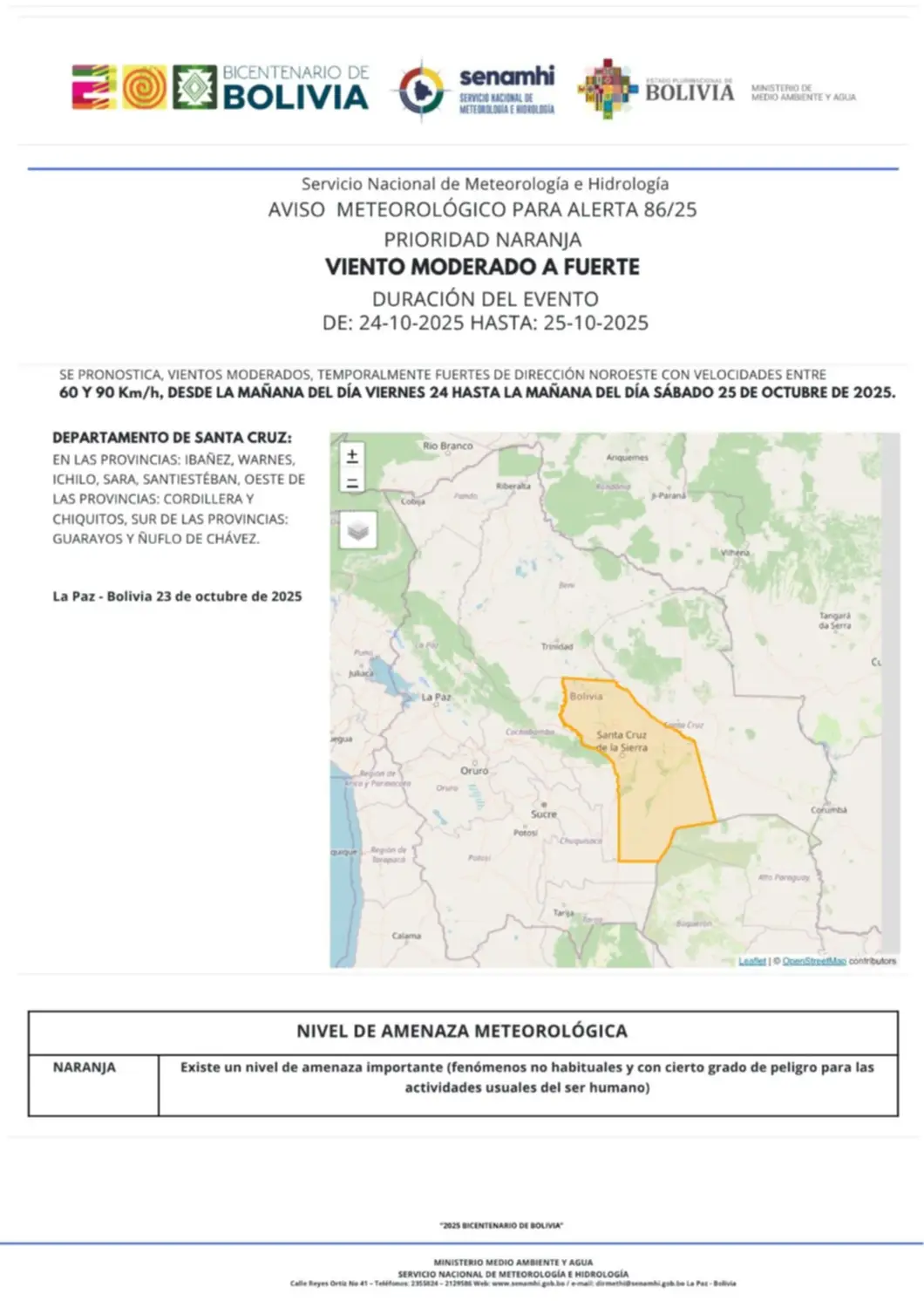 La alerta por ventarrones está vigente en las provincias Ibáñez, Warnes, Ichilo, Sara, Santiesteban, oeste de Cordillera y Chiquitos, sur de Guarayos y Ñuflo de Chávez.