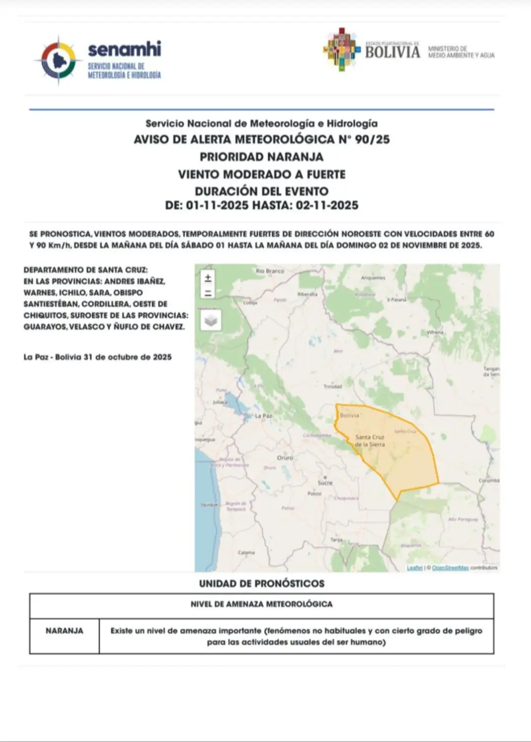 El Servicio Nacional de Meteorología e Hidrología (Senamhi) emitió una alerta de prioridad naranja por la presencia de vientos moderados a fuertes que afectarán varias regiones del departamento de Santa Cruz durante el fin de semana.