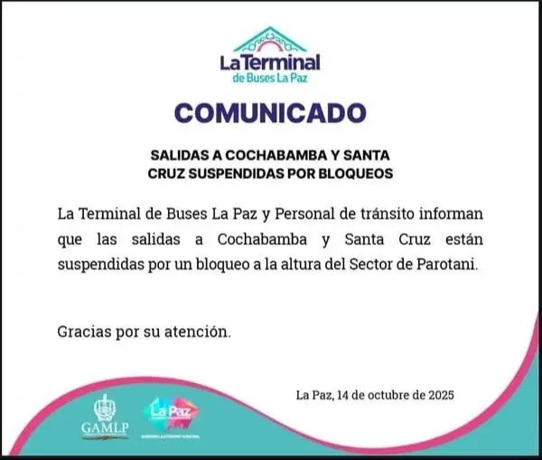 “La Terminal de Buses de La Paz y personal de Tránsito informan que las salidas a Cochabamba y Santa Cruz están suspendidas por un bloqueo a la altura del sector Parotani”, señala el comunicado emitido por la entidad.
