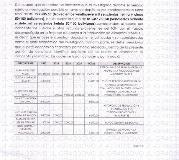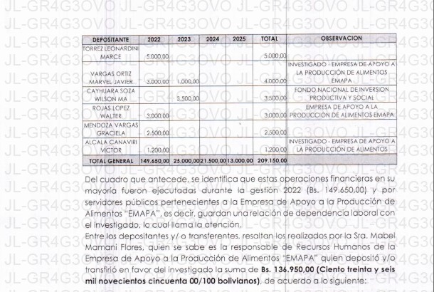 “Entre los depositantes y/ o transferentes, resaltan los realizados por la Sra. Mabel M. F., quien se sabe es la responsable de Recursos Humanos de la Empresa de Apoyo a la Producción de Alimentos «Emapa» quien depositó y/o transfirió en favor del investigado la suma de Bs. 136.950,00”, señala el informe.