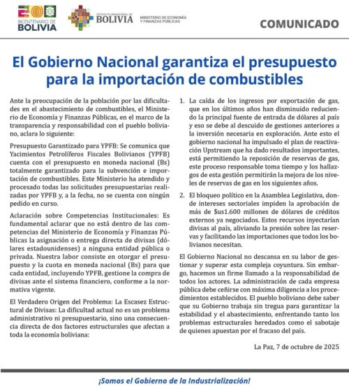«Es fundamental aclarar que no está dentro de las competencias del Ministerio de Economía y Finanzas Públicas la asignación o entrega directa de divisas (dólares estadounidenses) a ninguna entidad pública o privada. Nuestra labor consiste en otorgar el presupuesto y la cuota en moneda nacional (Bs) para que cada entidad, incluyendo YPFB, gestione la compra de divisas ante el sistema financiero, conforme a la normativa vigente», señala un comunicado del Ministerio.