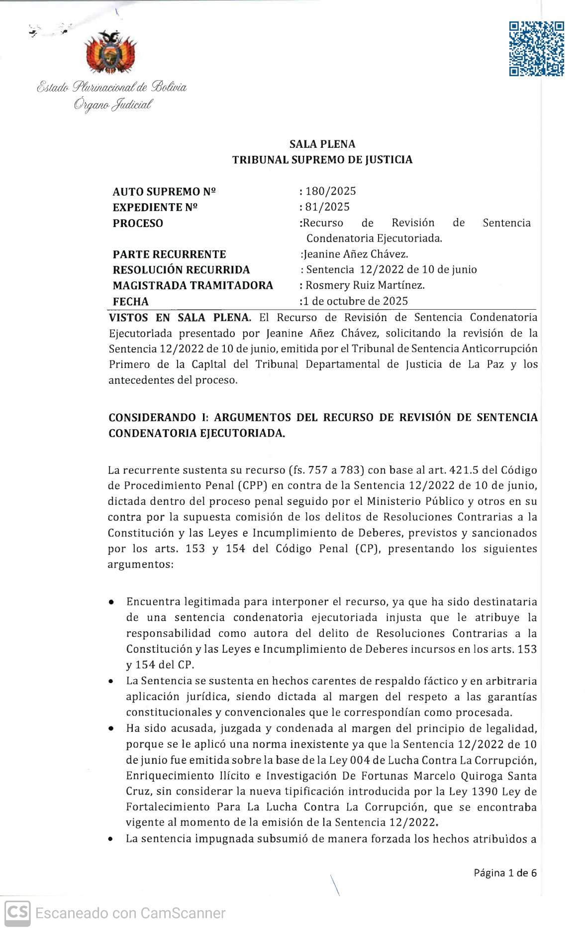 «El TSJ falla declarando admisible el recurso de revisión extraordinaria de sentencia condenatoria ejecutoriada presentada por Jeanine Áñez en cuanto hubiera lugar el derecho y dispone que el Tribunal de Sentencia Anticorrupción Primero del Tribunal Departamental de Justicia de La Paz que emitió la sentencia 12/2022 de 10 de junio remita los antecedentes originales, sea en el plazo de tres días», señala parte del auto supremo notificado este viernes a las partes.