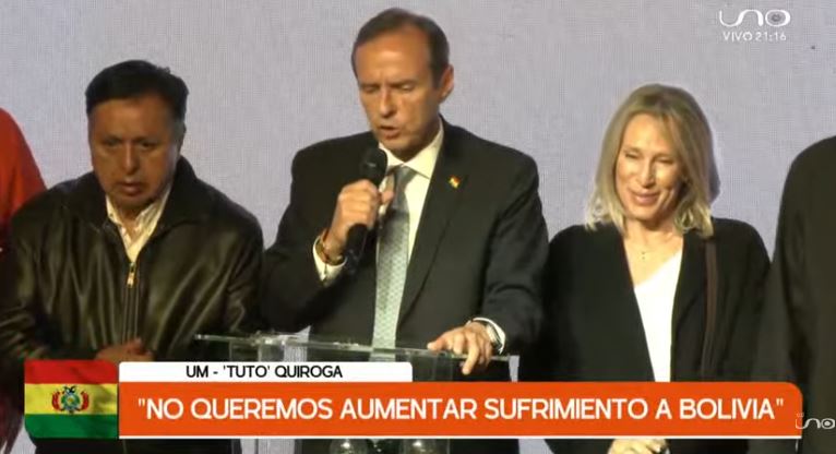 Durante su intervención, Quiroga informó que ya se comunicó con Rodrigo Paz para felicitarlo por su victoria. “Hablé con Rodrigo y lo felicité por el resultado obtenido» Pese al reconocimiento del resultado por parte del candidato de Libre, sus simpatizantes expresaron su rechazo a la aceptación de la victoria de Paz, por las denuncias de presuntas alteraciones en el conteo de votos.