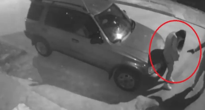 Mediante cámaras de vigilancia se puede observar a dos sujetos a bordo de una motocicleta que interceptan a la joven y la apuntan con un arma de fuego para robarle sus pertenencias.
