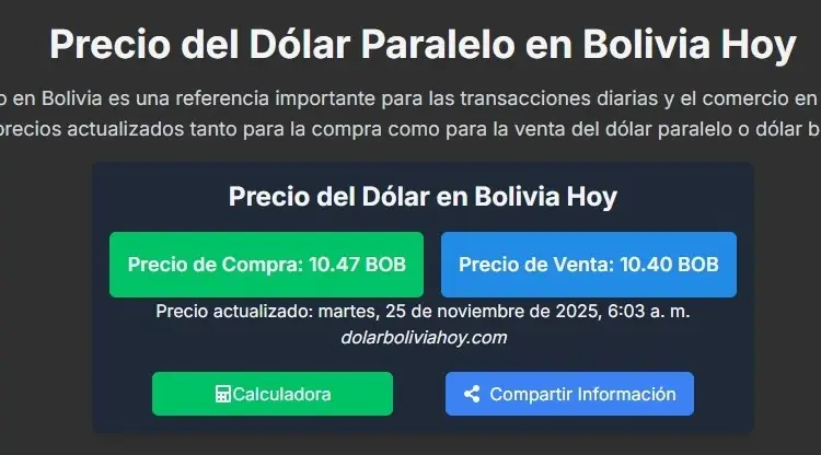 Según datos emitidos este martes 25 de noviembre de 2025 por el portal especializado dolarboliviahoy.com la divisa estadounidense se cotiza en el mercado paralelo con un precio a la venta de 10.40 (BOB) y un precio de compra de 10.47 BOB.