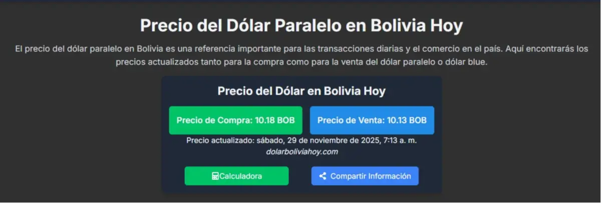 Según datos emitidos este sábado 29 de noviembre de 2025 por el portal especializado dolarboliviahoy.com, la divisa estadounidense se cotiza en el mercado paralelo con un precio a la venta de 10.13 (BOB) y un precio de compra de 10.18 BOB.