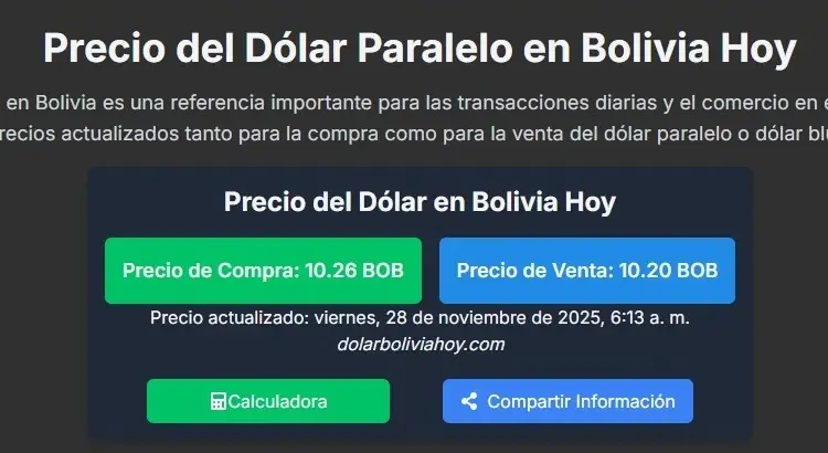 Según datos emitidos este viernes 28 de noviembre de 2025 por el portal especializado dolarboliviahoy.com, la divisa estadounidense se cotiza en el mercado paralelo con un precio a la venta de 10.20 (BOB) y un precio de compra de 10.26 BOB.