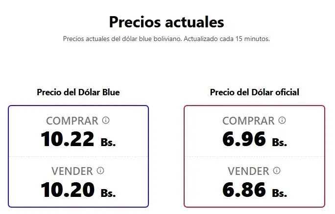 Por otro lado, según datos obtenidos por el sitio https://bolivianblue.net/#google_vignette, el dólar blue boliviano, que se actualiza cada 15 minutos, cotiza este viernes una variación, ya que a la compra se registra en 10.26 (BOB) y 10.21 (BOB) para la venta.