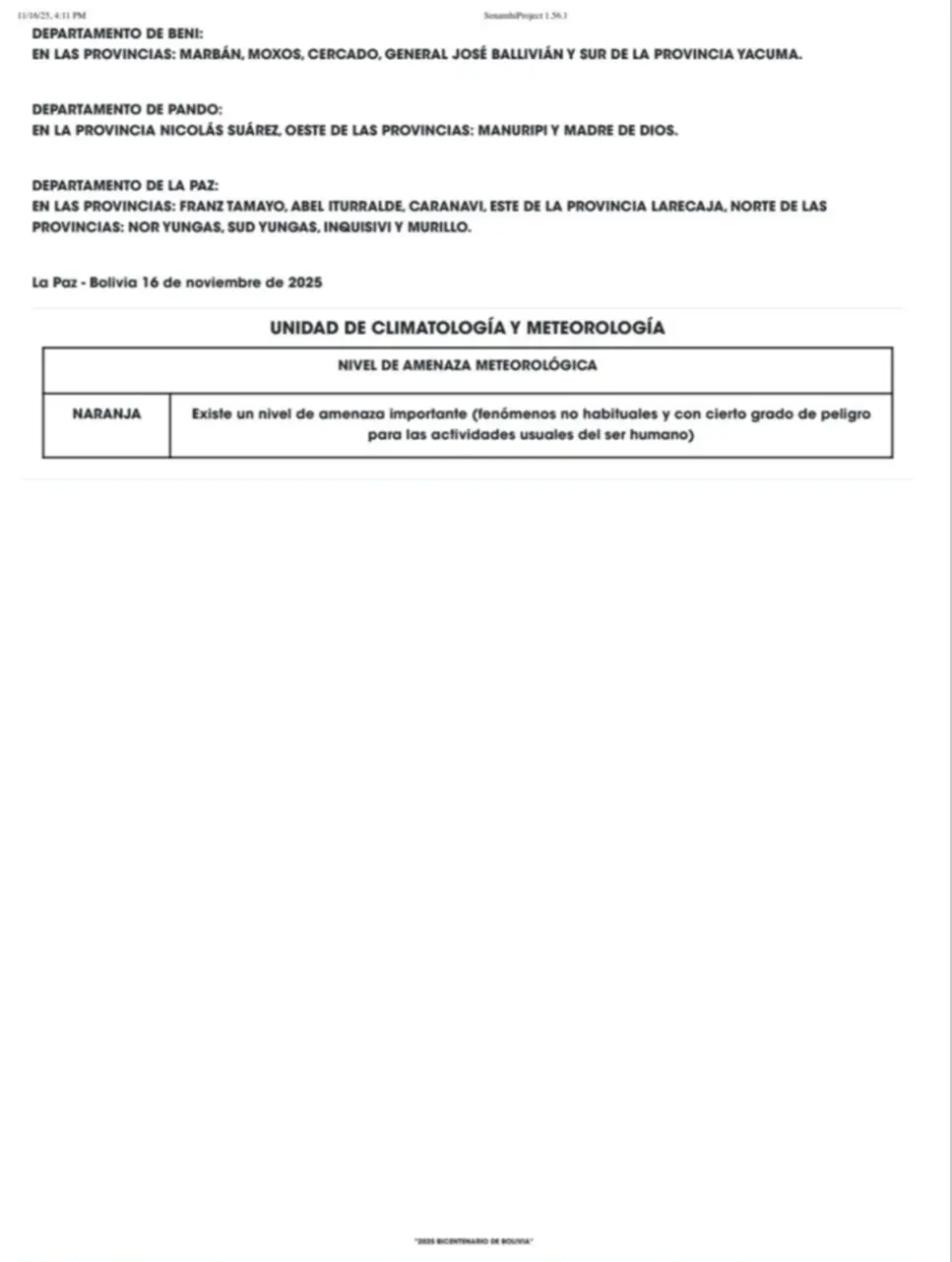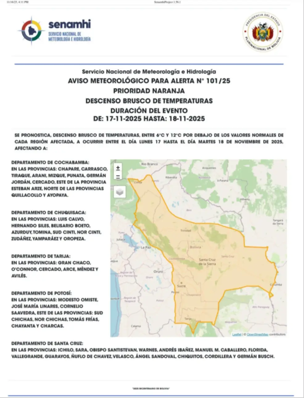 El Servicio Nacional de Meteorología e Hidrología (Senamhi) emitió este domingo una alerta meteorológica de prioridad naranja por un descenso brusco de temperaturas que se registrará entre el lunes 17 y martes 18 de noviembre de 2025.
