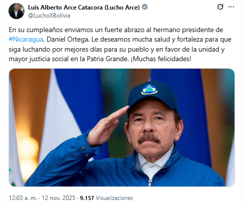 El expresidente Luis Arce reapareció este miércoles en redes sociales tras estar en silencio desde el viernes, último día de su mandato. Hoy publicó un mensaje de felicitaciones para el mandatario de Nicaragua, Daniel Ortega, quien está de cumpleaños.