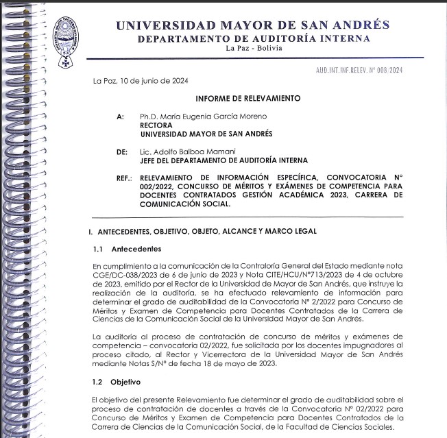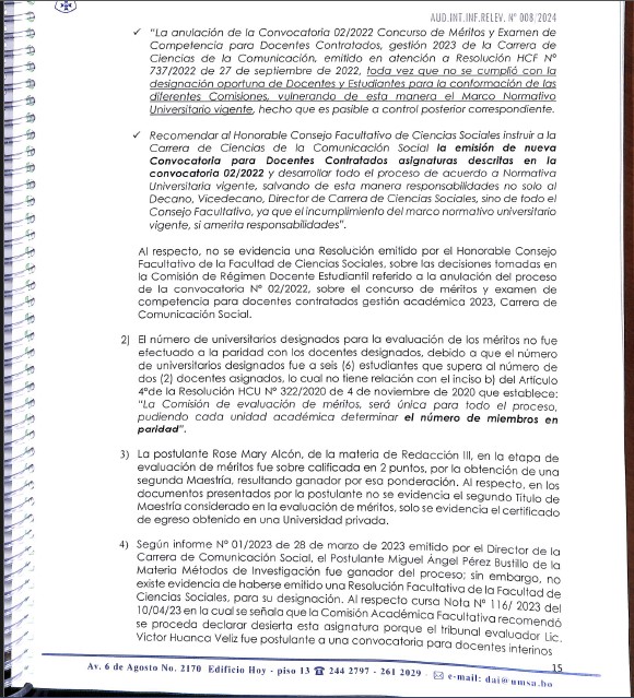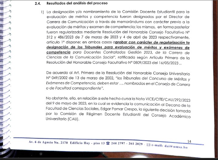 Una auditoría realizada por la Universidad Mayor de San Andrés (UMSA), que se realizó la gestión pasada, develó la existencia de irregularidades en el proceso de evaluación y designación de docentes interinos de la carrera de Ciencias de la Comunicación Social.