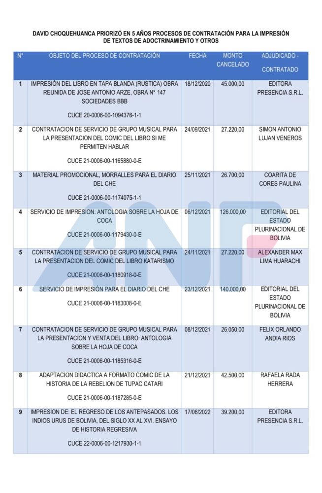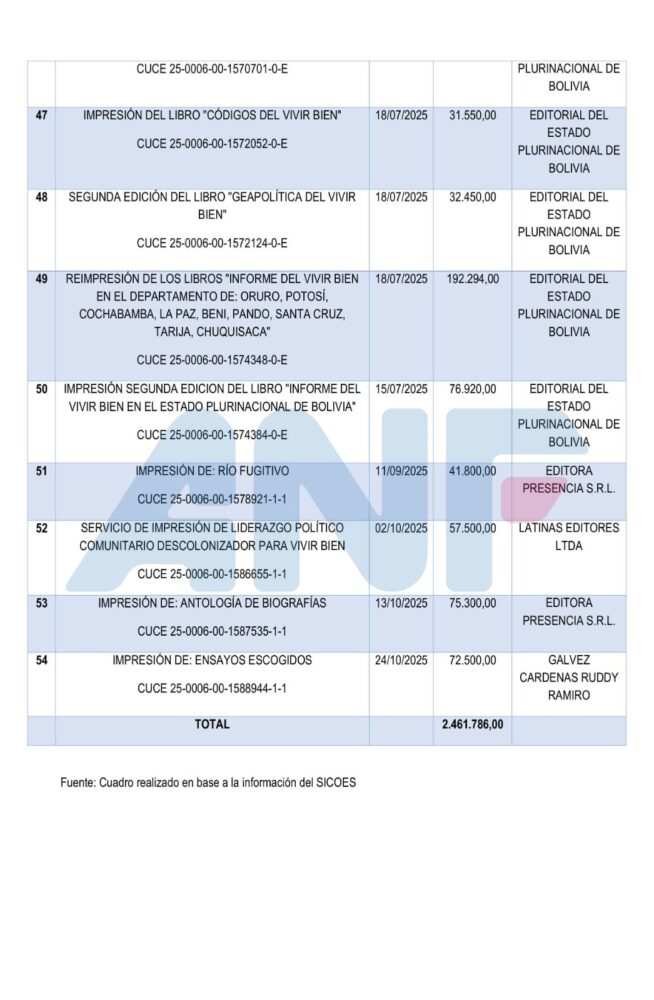 De acuerdo a un listado de la impresión de los libros, extraídos del sistema de contrataciones Sicoes, se tratan de 54 procesos de contratación que suman un total de Bs 2.461.786.