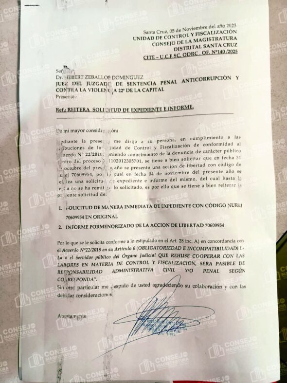 La Dirección Distrital del Consejo de la Magistratura de Santa Cruz, a través de su encargado distrital, el Dr. Emilio José Arredondo, se constituyó en el Juzgado de Sentencia Penal 22° de la capital cruceña con el objetivo de reiterar de manera formal y urgente una solicitud de remisión de expediente e informe.