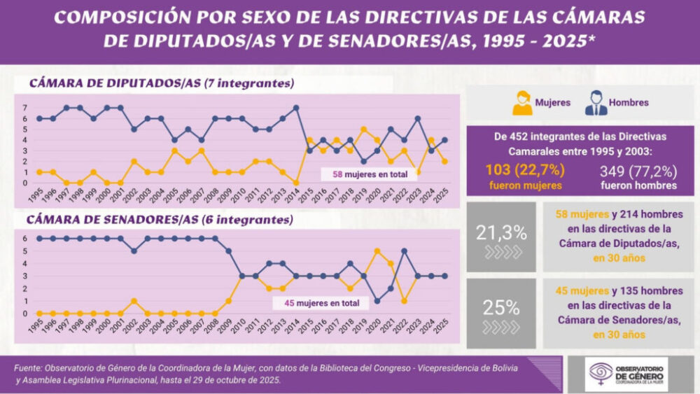 El recuento abarca de 1995 a 2025, con una presencia minoritaria de las mujeres en las directivas legislativas.