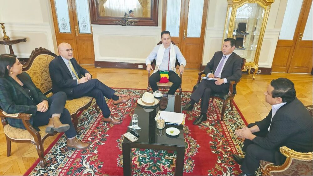La viceministra de Autonomías junto al ministro Lupo conversan con el vicepresidente Edmand Lara y su equipo en el palacio Vicepresidencial. Foto: Vicepresidencia