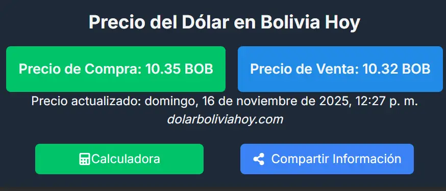 Según datos emitidos este domingo 16 de noviembre de 2025, por el portal especializado dolarboliviahoy.com, la divisa estadounidense se cotiza en el mercado paralelo con un precio a la venta de 10.32 (BOB), y un precio de compra de 10.35 BOB.