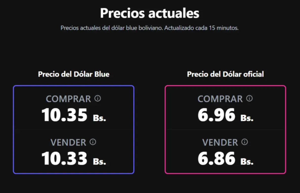 Por otro lado, según datos obtenidos por el sitio https://bolivianblue.net/#google_vignette, el dólar blue boliviano que se actualiza cada 15 minutos, cotiza este domingo una variación, ya que a la compra se registra en 10.35 (BOB), y 10.33 (BOB), para la venta.