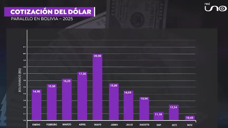 El economista remarcó que esta situación ha abierto una brecha significativa entre el tipo de cambio oficial, que actualmente se mantiene en 10,43 bolivianos, y el paralelo, que llegó a cotizarse en 20 bolivianos en julio pasado, aunque en los últimos días ha mostrado una tendencia a la baja.