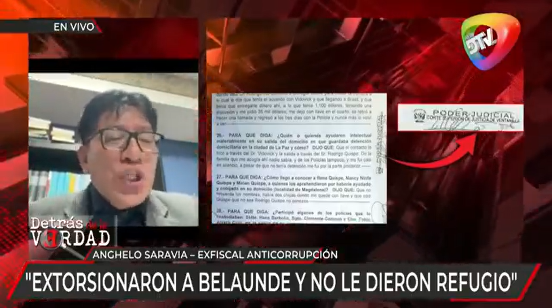 “El señor Martín Belaunde llegó a Bolivia porque el gobierno de Evo Morales, mediante su ministro de Gobierno, Hugo Moldiz, le prometió refugio político. Luego, cuando el Conare le negó esa solicitud; la Corte Suprema, presidida por Pastor Mamani, le dio detención domiciliaria tras recibir más de 70 mil dólares en Sucre”, sostuvo Saravia en alusión a una supuesta coima que habría recibido la exautoridad judicial.