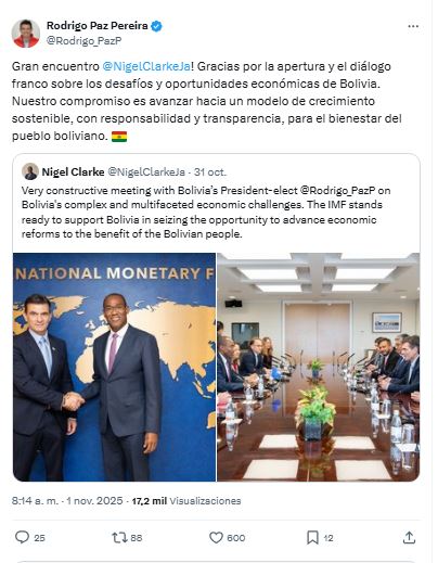 “Reunión muy constructiva con el presidente electo de Bolivia Rodrigo Paz sobre los complejos y multifacéticos desafíos económicos del país. El FMI está dispuesto a apoyar a Bolivia para que aproveche la oportunidad de impulsar reformas económicas en beneficio del pueblo boliviano”, señaló Clarke a través de su cuenta oficial de la red social de X.