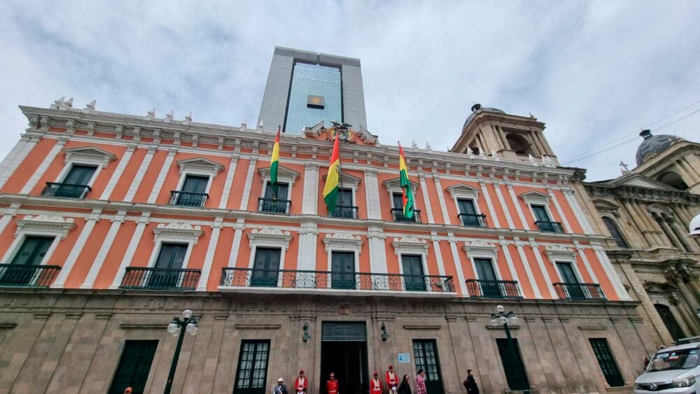 Frontis del Palacio Quemado; atrás, la Casa Grande del Pueblo. Foto: Erbol
