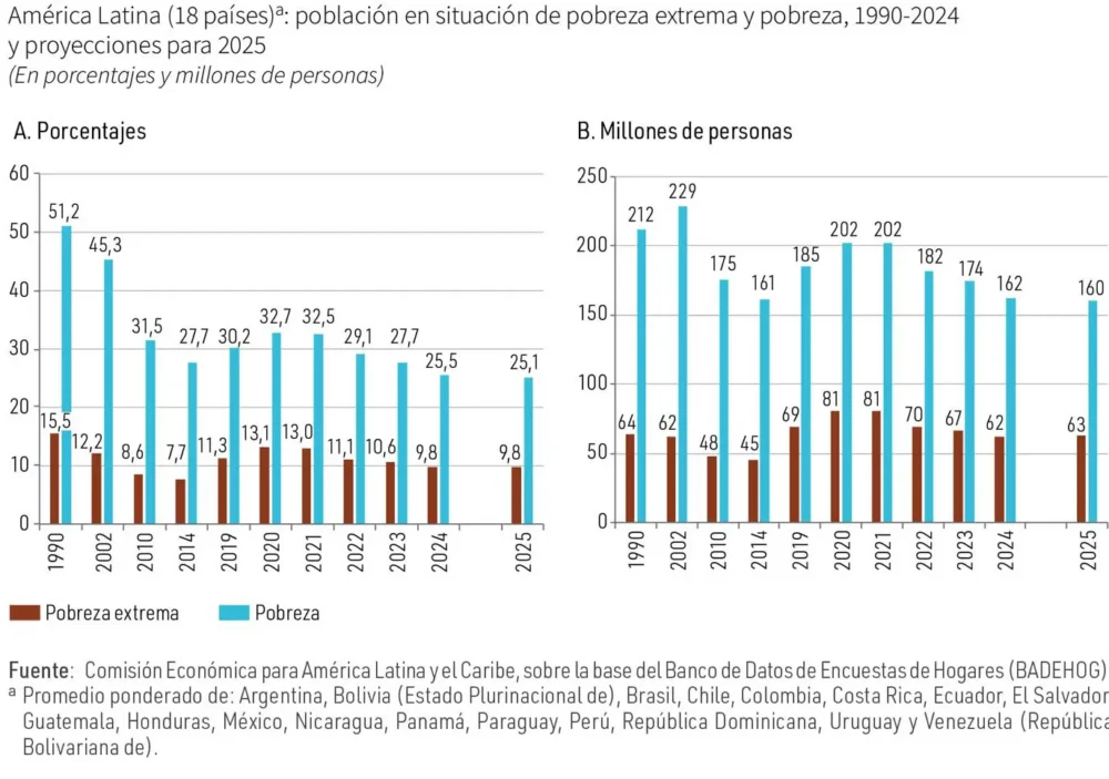 El Panorama Social de América Latina y el Caribe 2025 de la Cepal indica que el 25,5% de la población latinoamericana (162 millones de personas) se encontraba en situación de pobreza por ingresos en 2024, lo que significa una disminución de 2,2 puntos porcentuales respecto de 2023 y de más de 7 puntos porcentuales en comparación con 2020.