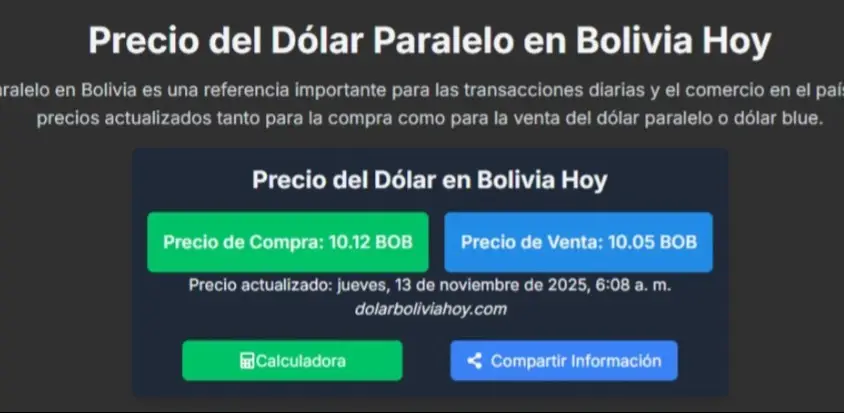 Según datos emitidos este jueves 13 de noviembre de 2025, por el portal especializado dolarboliviahoy.com, la divisa estadounidense se cotiza en el mercado paralelo con un precio a la venta de 10.05 (BOB), y un precio de compra de 10.12 BOB.