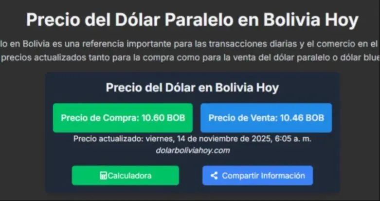 Según datos emitidos este viernes 14 de noviembre de 2025, por el portal especializado dolarboliviahoy.com, la divisa estadounidense se cotiza en el mercado paralelo con un precio a la venta de 10.46 (BOB), y un precio de compra de 10.60 BOB.